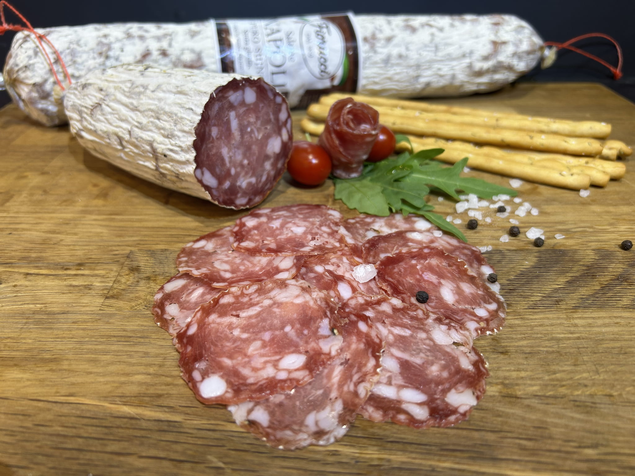 Salami Napoli z Pieprzem to oryginalna włoska wędlina dojrzewająca pochodząca z regionu Kampania, jednego z najbardziej znanych regionów południowych Włoch. Produkt przygotowany jest z wieprzowiny i oferowany w formie cienko krojonych plastrów, dzięki czemu jest od razu gotowy do podania.